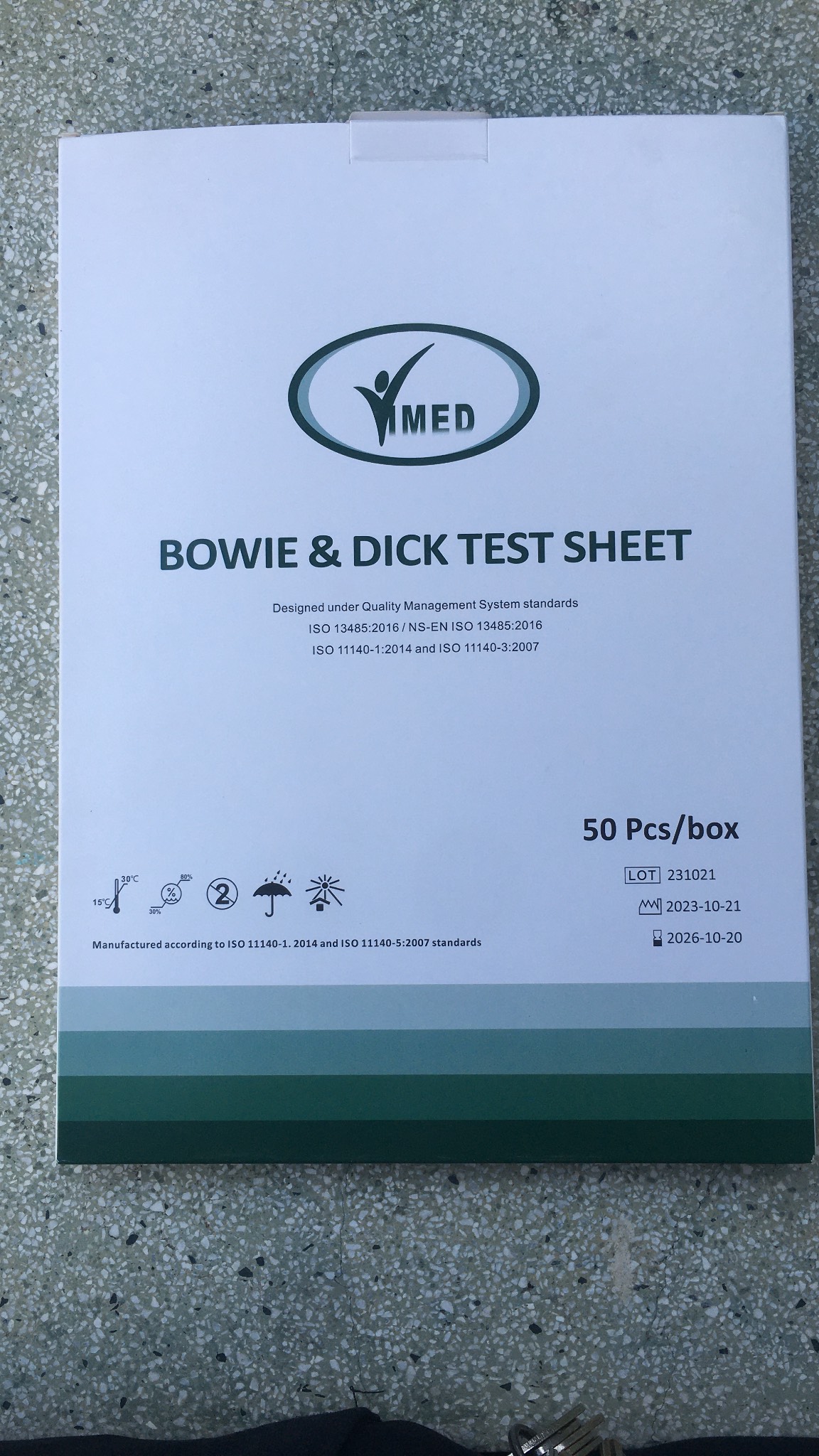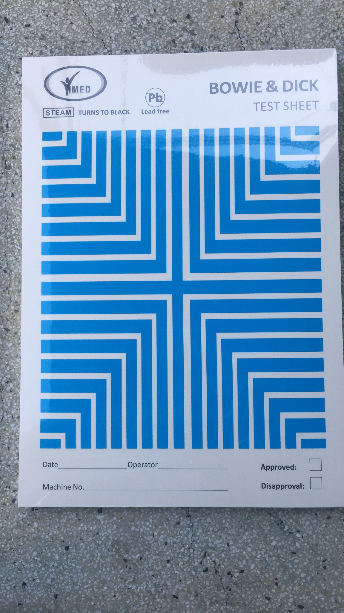Tờ test Bowie-Dick, dùng để kiểm tra chất lượng hút chân không của lò tiệt khuẩn hơi nước nhiệt độ cao có hút chân không, chu trình 132oC-134oC x 4 phút. Khi sử dụng, cần soạn 1 gói vải có độ dày tương đương 16 lớp khăn, nhét tờ test vào giữa gói vãi và đưa vào lò chạy test.