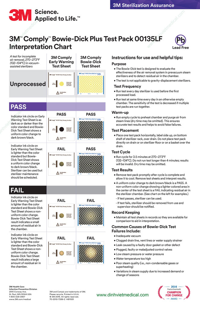 Là một Màn hình Thiết bị, Gói Thử nghiệm 3M ™ Comply ™ Bowie-Dick Plus với Bảng Cảnh báo Sớm 00135LF được thiết kế để kiểm tra hiệu quả loại bỏ không khí của máy tiệt trùng hơi nước loại bỏ không khí động 132-134˚C (270-273˚F). Các gói thử nghiệm sẽ phát hiện không khí còn sót lại trong buồng tiệt trùng do rò rỉ khí, không loại bỏ khí và chân không không đủ. Gói thử nghiệm Comply Bowie-Dick 00135LF có bảng cảnh báo sớm được thiết kế để phát hiện sớm các lỗi thoát khí trước khi chúng xuất hiện trên tờ thử nghiệm chính. Tuân theo ANSI / AAMI / ISO 11140-5: 2007 và là Chỉ số Đặc biệt Loại 2 (Loại s2) được phân loại theo ISO 11140-1: 2014.